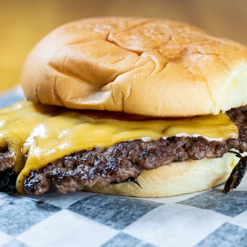 A juicy classic American smash burger topped with melted American cheese, drizzled with tangy ketchup, and a hint of mayo and mustard, topped with pickles, all sandwiched between a toasted bun.