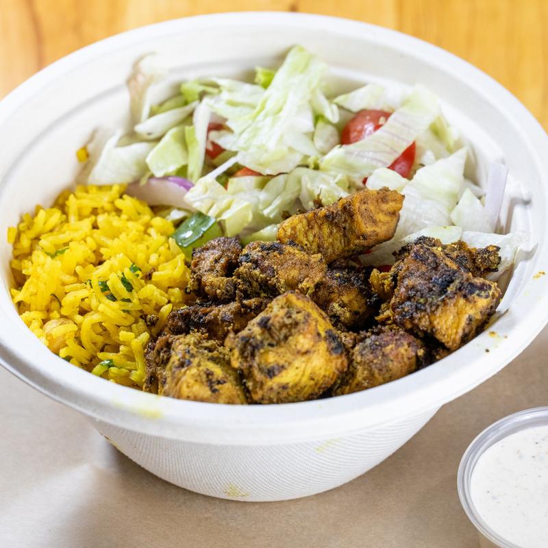 Choose between tender halal-style chicken or crispy falafel, served atop fragrant basmati rice, with chickpeas, crisp lettuce, juicy tomato, crunchy cucumber, and fresh onion, all drizzled with creamy white sauce.